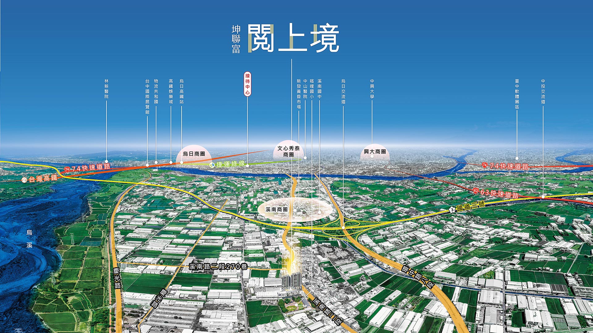 「閱上境」掌握大台中東西、南北向任督二脈,銜接國1、國3、台74線、台63線、環中路、高鐵,搶搭捷運紅線與綠線經濟效應,全面整合大台中及跨城市的交通脈絡,享受美好生活沒有界線。