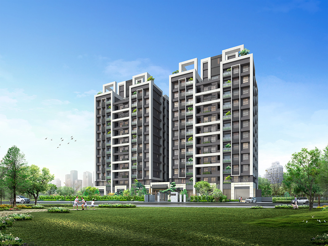 在沈穩壯闊立面結構中,搭配細膩俐落的框架線條,闊氣面寬與質感街廓,將改變溪南大道城市地貌,以芬多精營造前庭後院,與居住者交織和諧迴響,建築表情隨著陽台,擁抱樹海與天光,傲視無敵視野。