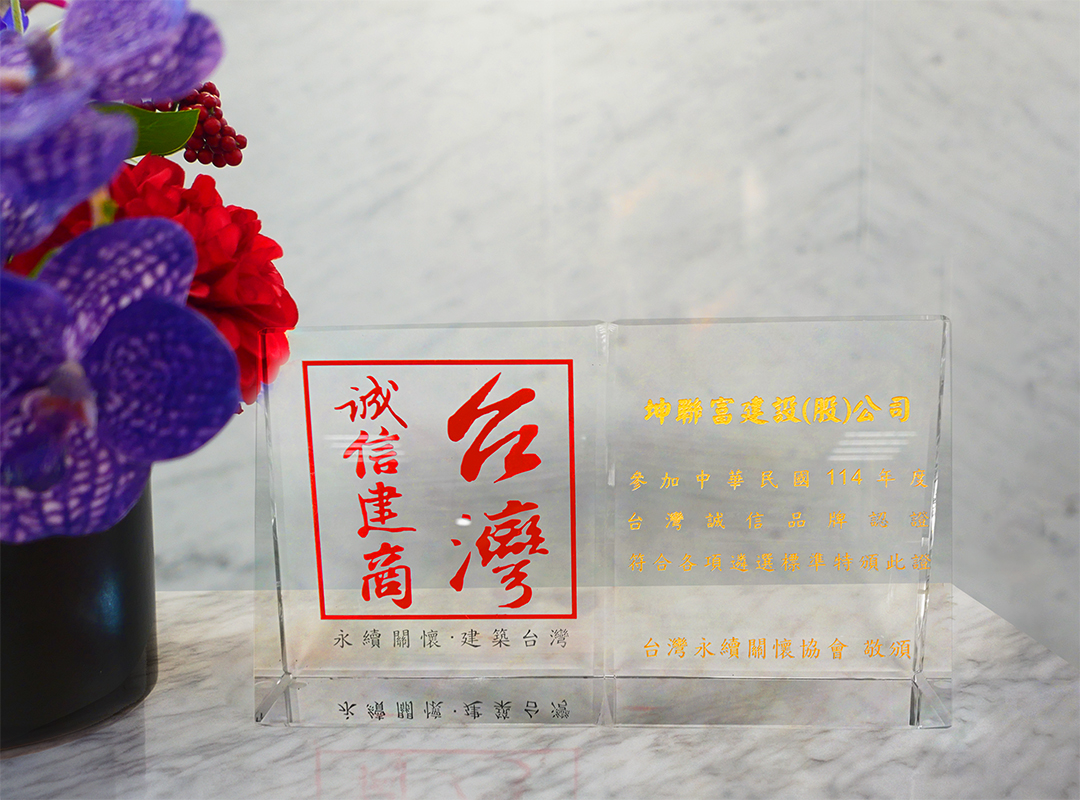 誠信,是建築的根基;細節,是品質的高度,我們始終堅持「專注建築本質、實踐品質承諾」,以穩健務實態度,致力打造值得信賴的建築,因著這份堅持,今年榮獲《台灣誠信建商》肯定,此獎項是為了保護消費者權益而設立的認證制度,透過專業評審團嚴格審核企業商譽、銀行信用、消費糾紛等嚴謹徵信作業及積極追蹤覆核而評定。